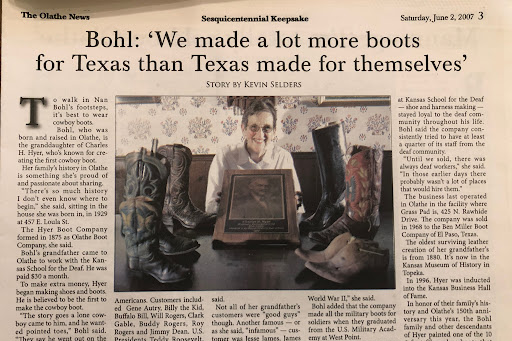 Born and raised in Olathe, Nanette Bohl grew up with the same pioneering spirit that drove her grandfather to create HYER Boots. Her early memories of riding her horse, Sneaky, through the then-small town, before it blossomed into the thriving city it is today, offer a glimpse into the deep connection she had in the community. Nana’s life was filled with adventure and joy, and one of the most charming stories of her youth was how she met her future husband on a ski trip—he had ripped his pants and called out for a safety pin, which Nana just happened to have. That chance encounter led to a lifetime of love and partnership.