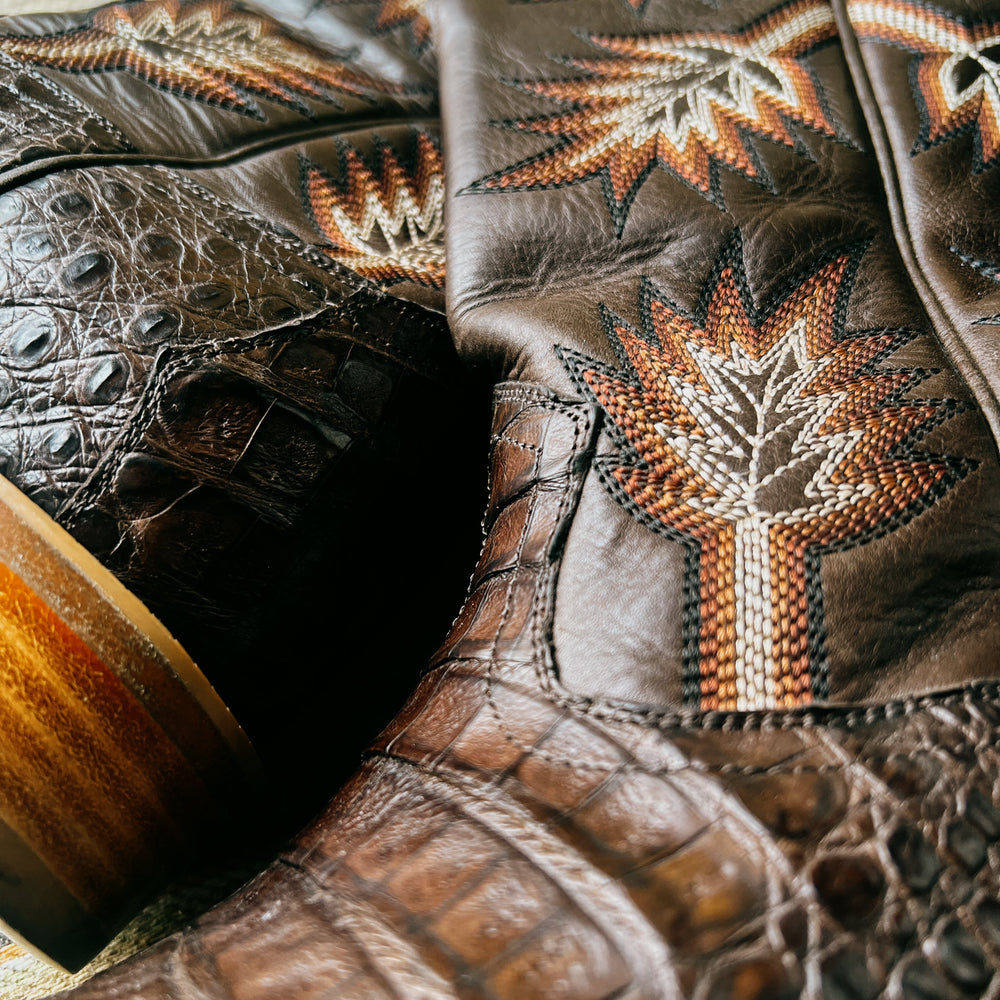 We’ve blended our founder’s signature "Olathe" stitch design with the rich texture of premium caiman crocodile and our popular broad square toe to craft a boot that commands attention and stands apart.