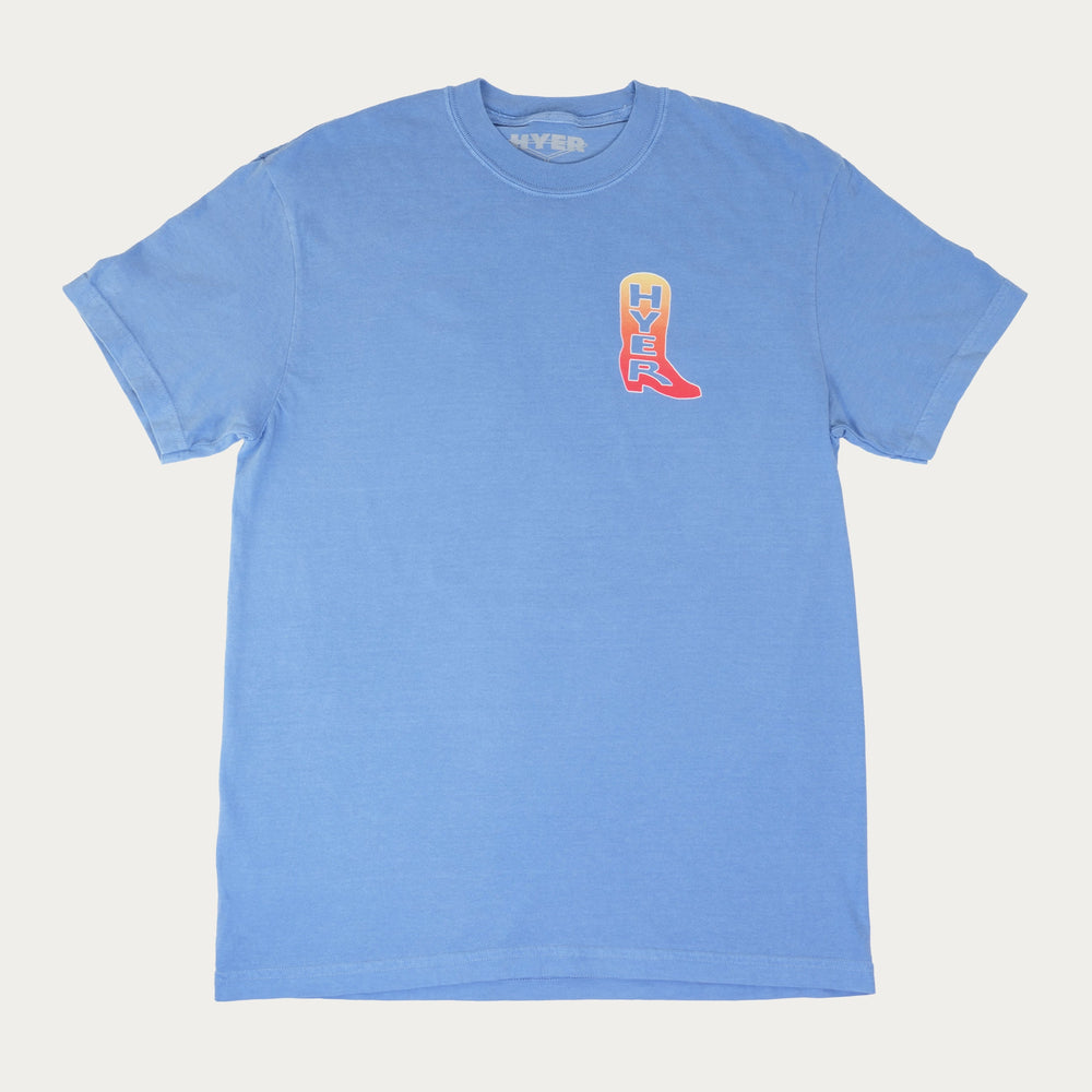 Inspired by our fine Kansas sunsets, this 100% cotton midweight tee sports our HYER boot logo on the front and our signature branding iron seal on the back in a striking gradient finish. Durable and garment-dyed with a relaxed fit, this shirt holds its shape and wears easy.
